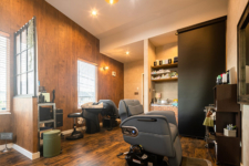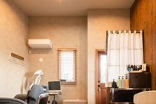 お打合せの際に決まった美容室『MALIBU』は、天井を高くし落ち着いたトーンの床材やクロスを使うことで、インダストリアルな雰囲気に。