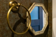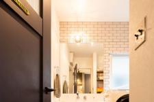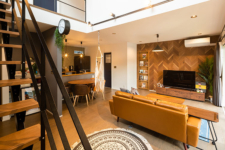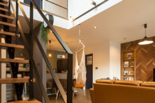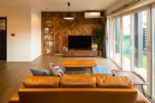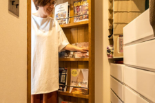 リビングのヘリンボーン壁の一部にある本棚は、実はシークレットドア。中に進むとファミリークローゼットになっています。