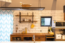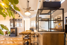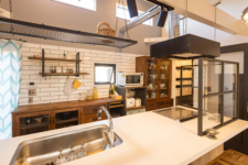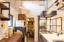 キッチンは憧れのペニンシュラ。上部にあるレンジフードはA様が探して見つけたもので配管をあえてむき出しにして、インダストリアルスタイルに。IHクッキングヒーターの前にある油飛びを防ぐ格子ガラスはオーダーメイドです。