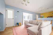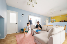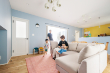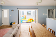 庭と一体のリビングは窓全開で、子供たちが内と外を走り回っています。