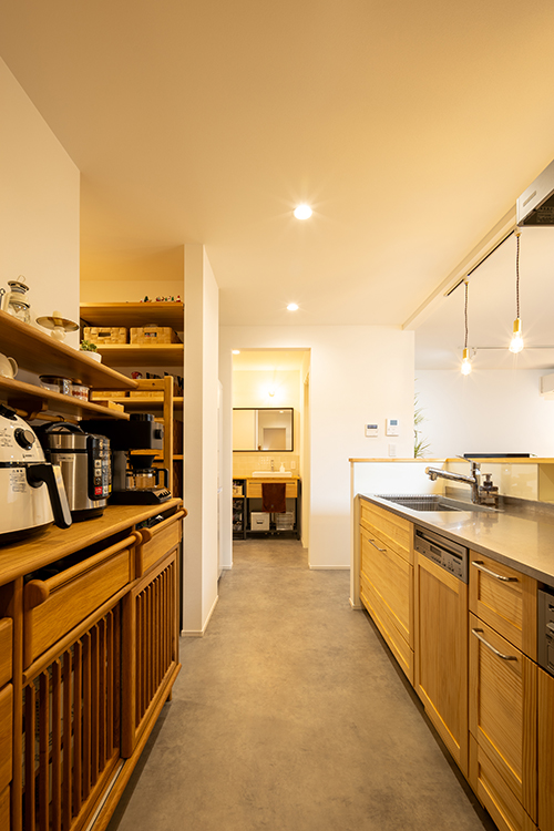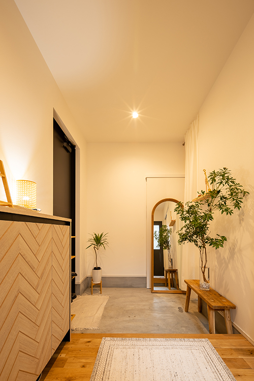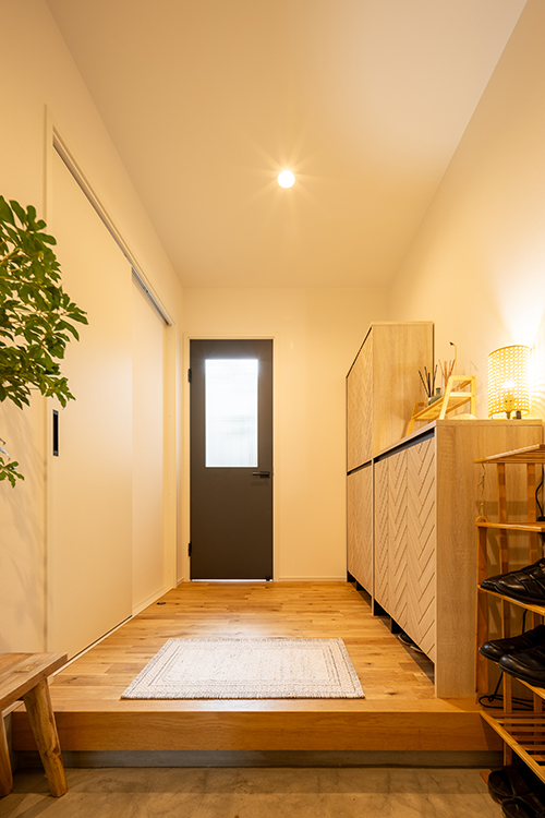 ウッドワンのキッチンや広めの玄関、使いやすい家事動線など、暮らしやすさにもこだわりが光ります。プランや仕様については担当者が細やかにご提案し、間取りや設備はもちろん、店舗イメージまで丁寧にサポートさせていただきました。