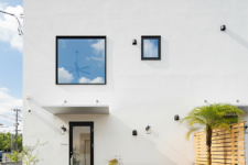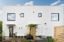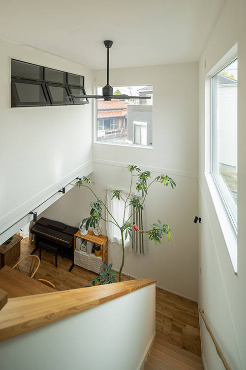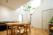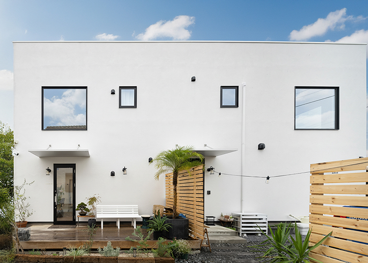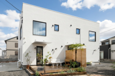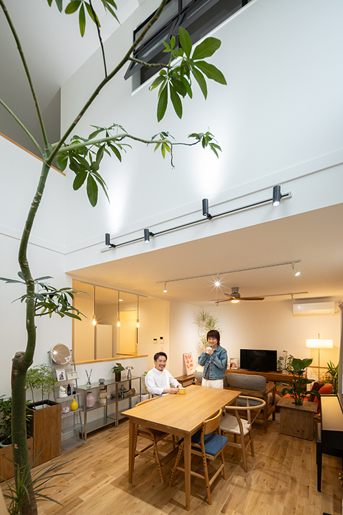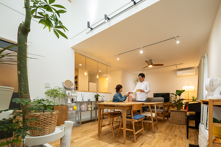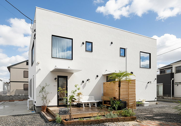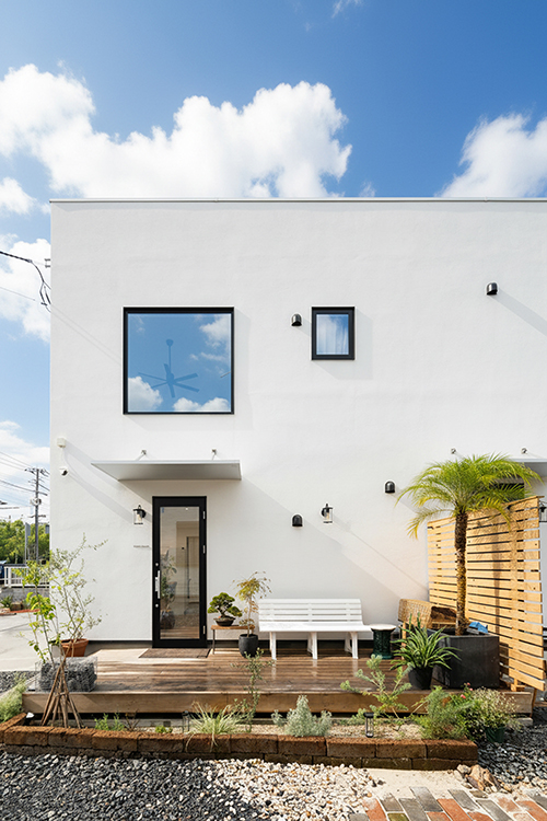 店舗併用住宅としての機能性とデザイン性を兼ね備えたM様邸。白を基調としたすっきりとした外観は、塗り壁やウッドデッキ、グリーンを取り入れることで、やわらかくおしゃれな印象に仕上がっています。室内は吹き抜けのある開放的なリビングに無垢材を採用し、ぬくもりあふれる心地よい空間となりました。